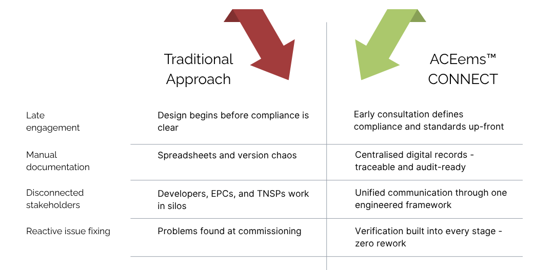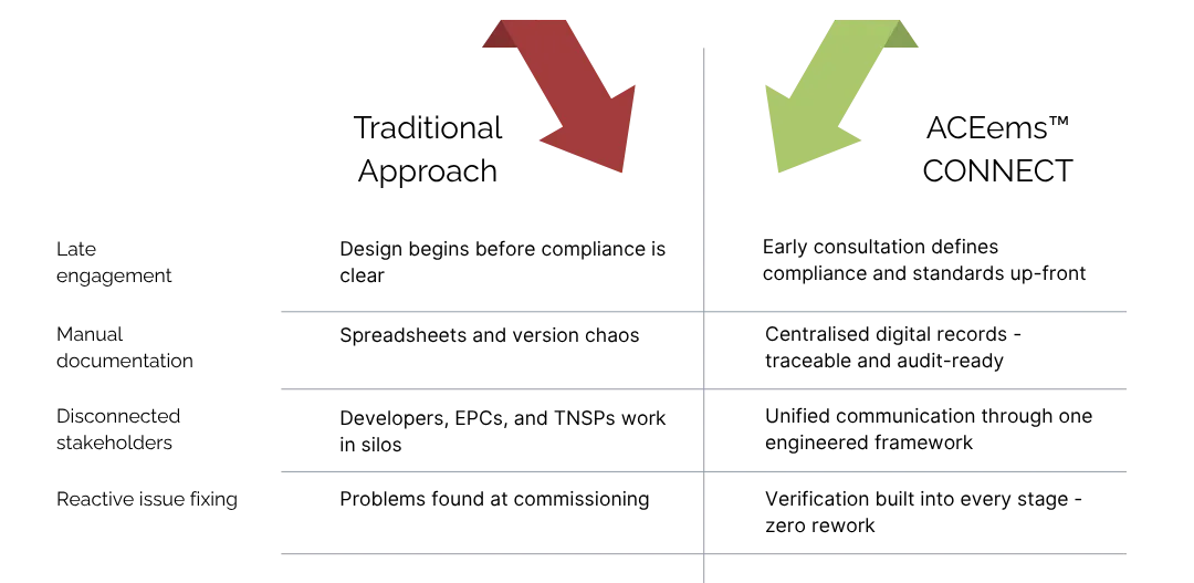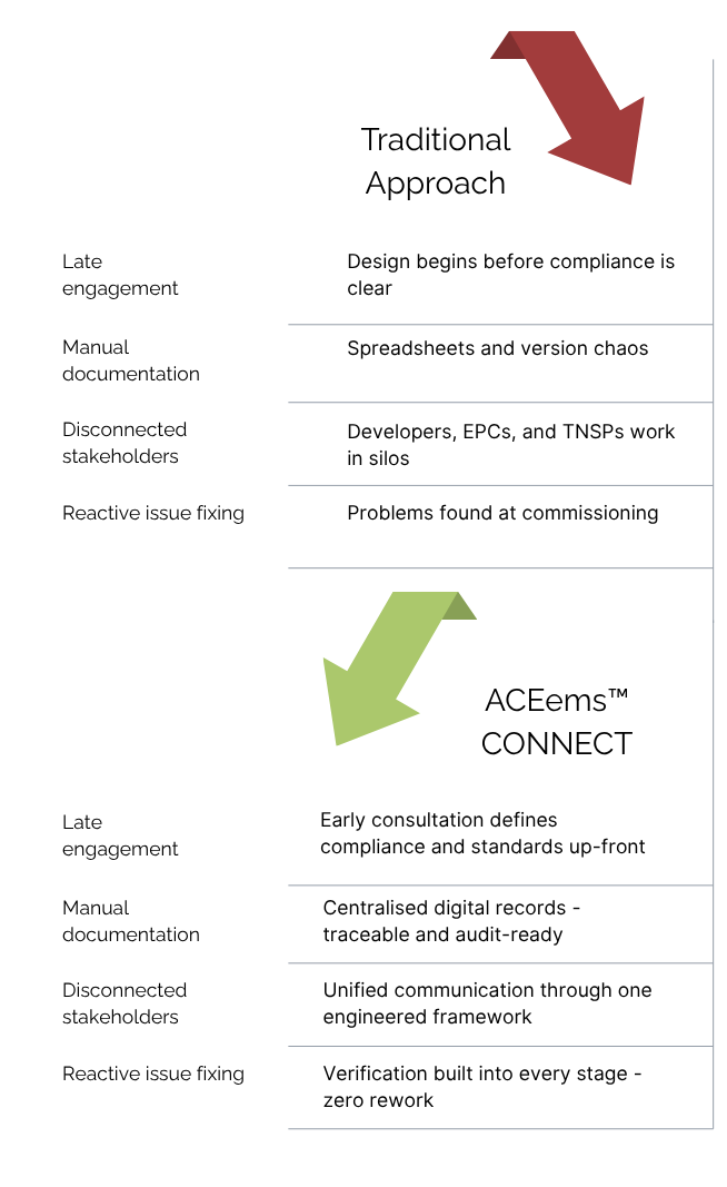ACEems™ CONNECT was designed to remove that uncertainty. It’s a structured, engineered framework that embeds compliance, precision, and verification into every phase of your project - from consultation through commissioning.
